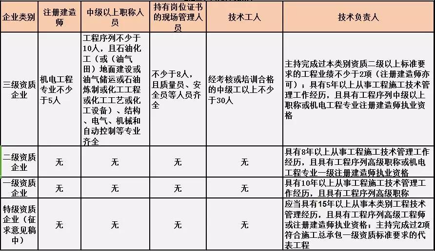 換句話說,并不是所有企業(yè)資質(zhì)都不要求有建造師等企業(yè)人員。施工總承包三級資質(zhì)企業(yè)對建造師等人員仍有要求,一級資質(zhì)、二級資質(zhì)企業(yè)保留技術(shù)負(fù)責(zé)人這一項要求,特級資質(zhì)另有規(guī)定。