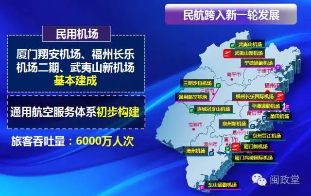 民航計(jì)劃完成投資800億,廈門翔安機(jī)場、福州長樂機(jī)場二期、武夷山新機(jī)場基本建成,通用航空服務(wù)體系初步構(gòu)建。全省民航旅客吞吐量突破6000萬人次。